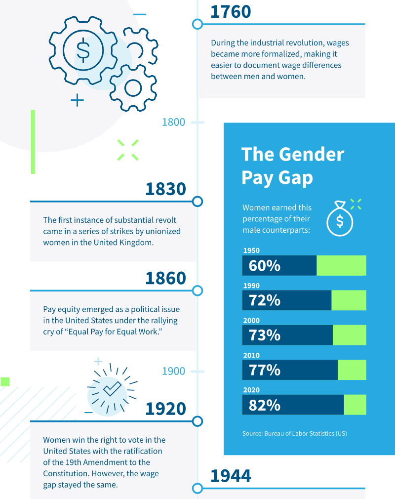 The history of pay equity dates back to the industrial revolution. During these times salaries were formalized and documented which made it easier to track pay differences between men and women.